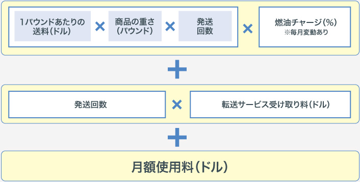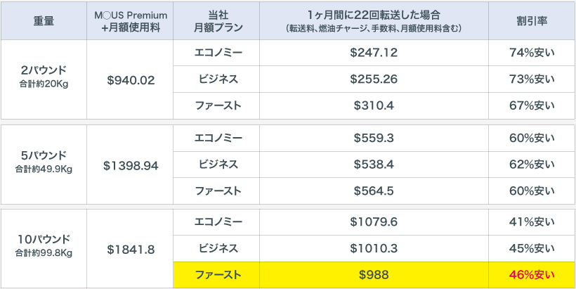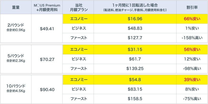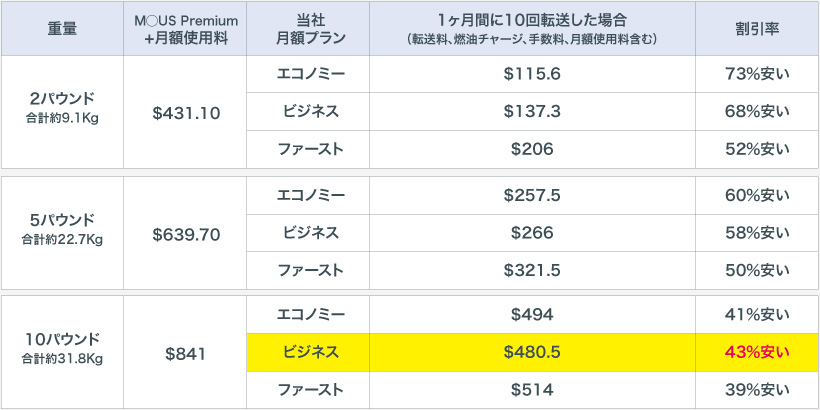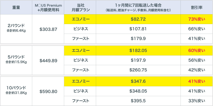 例) 重量 2 パウンドの商品をエコノミークラスでひと月に7回転送した場合(燃油チャージは10%として)